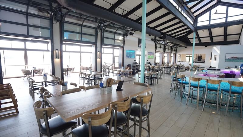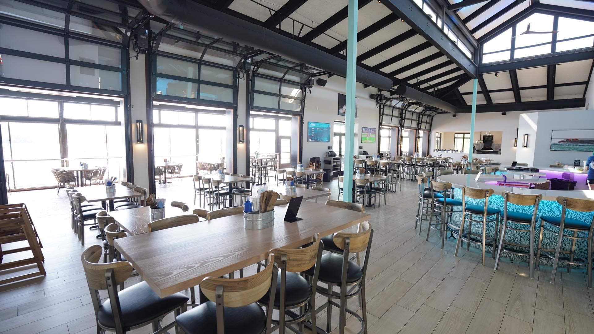 Our recent renovations include an updated floor plan, a stylish bar seating 40+ guests, 6 floor-to-ceiling glass garage doors offering breathtaking views, 14 flatscreen TVs, and brand-new furniture, fixtures, and décor.